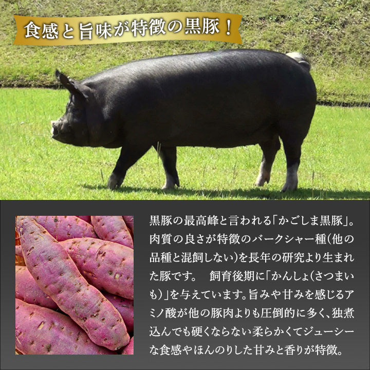 「軟らかく、歯切れがよく、うま味がある」が特徴のかごしま黒豚を美味しく食べるには、ズバリしゃぶしゃぶが一番だと言われています。たくさん食べてもお腹はもたれにくい、さらには野菜もたっぷり摂れて美味しくヘルシー。かごしま黒豚肉は、筋繊維が細かいので歯切れが良く、柔らかいのが特徴。サツマイモを含んだ飼料を食べることにより、旨味・甘みが増すとともに、脂肪の融点が高くなり、脂がべとつかずさっぱりとしている。タンパク質・ビタミンBが豊富で、アミノ酸を多く含んでいます。