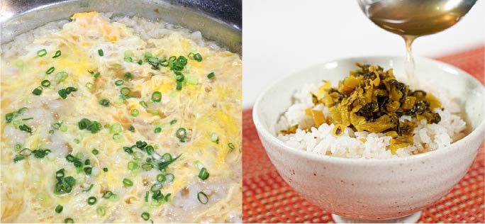 〆(しめ)は、旨みたっぷりの出汁を注いで「高菜茶漬け」や「雑炊」で、最後の一滴までお楽しみください。