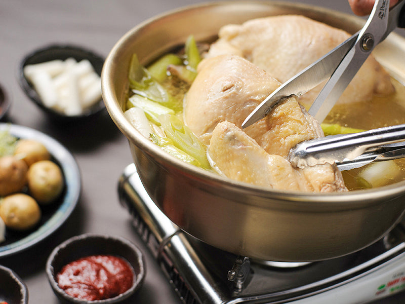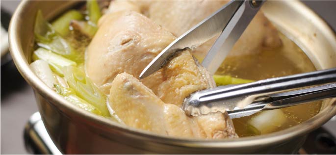タッカンマリとは鶏一羽という意味の韓国の水炊きです。じっくり煮込んだ鶏をハサミで切り分けてコラーゲンたっぷりの濃厚なスープといただくと、大変美味です。薬膳の蔘鷄湯とは、似ているけど豪快さはその比ではありません。どうしても、韓国東大門で食べた、あのタッカンマリを再現して、是非皆さまに食べて欲しいと、色々な鶏を取り寄せて試食しました。試行錯誤の末、九州ブランド鶏《なでしこ姫鶏》を使った【タッカンマリ】が完成しました。