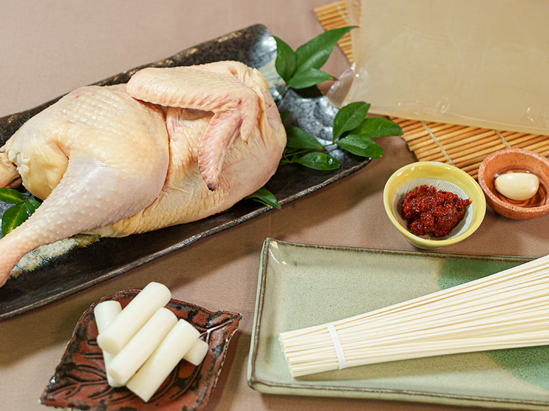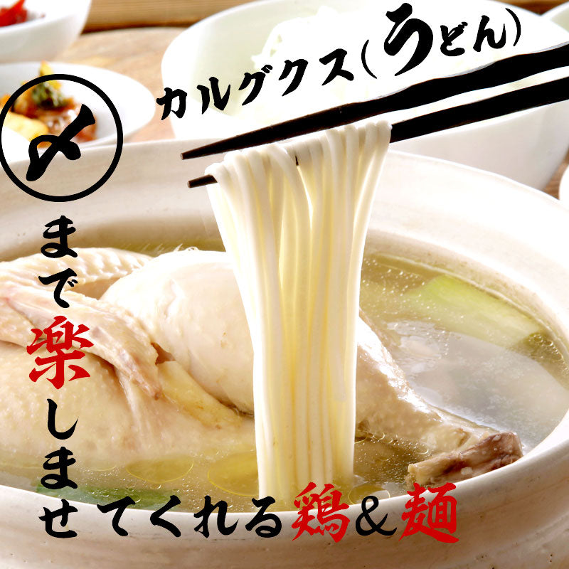 【4~5人前】鶏1羽2100~2300g+スープ1980g+カルグクス(乾麺)200g+トッポギ90g+タデギ40g+醤油33g+酢30g+からし6g+ニンニク10g 箱304g 4293g