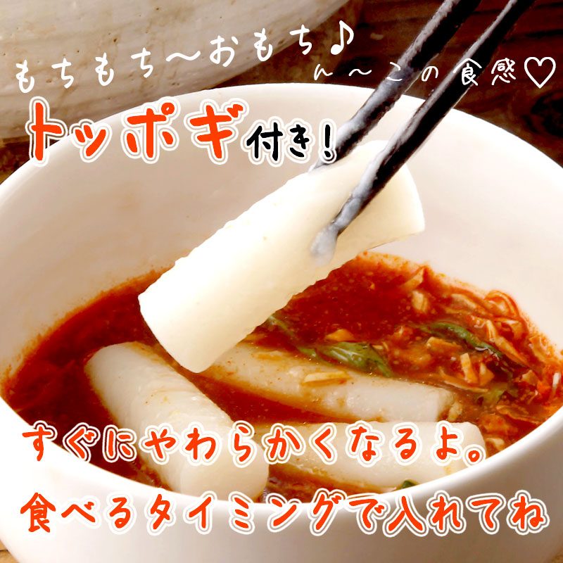鶏肉(九州産)、汁(昆布、鶏がら、野菜、焼あご、鯖節、鰹節、酒、食塩)、干しうどん(小麦粉、食塩、小麦たんぱく、加工でんぷん)、トッポギ(白米粉)、タデギ(コチュジャン、しょうゆ、唐辛子、ごま、酒、にんにく、穀物酢 /調味料(アミノ酸等)、甘味料(サッカリンNa)、(一部に鶏肉・小麦・大豆・さば・ごま・酒精を含む)