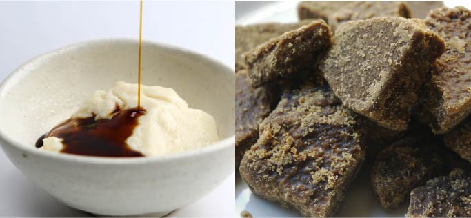 黒蜜 de 独楽豆腐の黒蜜は、南国の太陽で育ったサトウキビ100%の黒砂糖を使用しています。カロリーが低めでミネラル・カルシウム・ビタミンが豊富です。ほろ苦くてコクのある甘みが独楽豆腐とよく合い、甘味としてバランスよく仕上がりました。